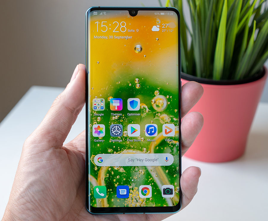 Но нека продължим напред и по-точно към предния панел, където откриваме споменатия вече двустранно извит OLED дисплей с капковидно изрязване за селфи камерата. Той е обграден от сравнително тънки рамки, но зоната под него е осезаемо по-широка, но все пак значително по-тясна от тази при P20 Pro, защото там беше поставен сензорът за отпечатъци. При P30 Pro той е вграден в дисплея, и макар че ползва оптична технология, работи изненадващо добре, като определено е по-бърз от този в Mate 20 Pro. Конструкцията на устройството отново е водоустойчива (IP68), а изработката му е прецизна, както подобава на флагмански модел.