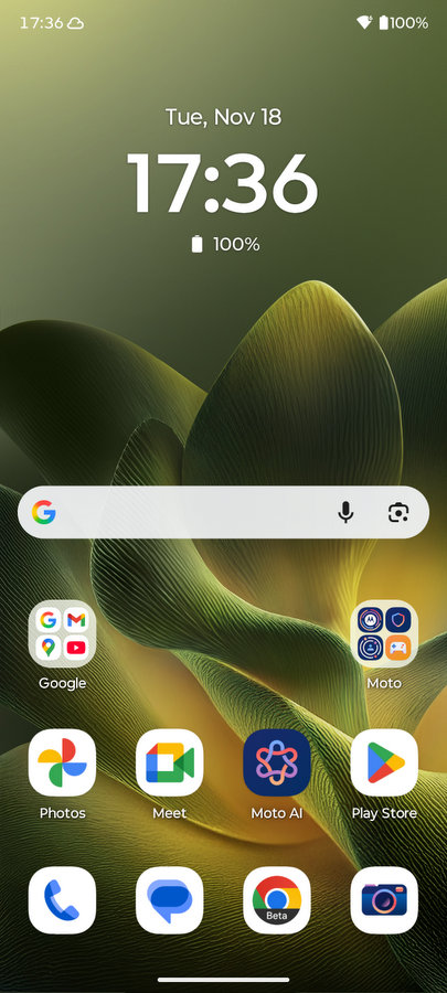 При нас беше цвят Bronze Green, който изглежда много приятно със своето маслиненозелено оцветяване и жълтозелени акценти около камерата и в бутона за активиране на moto ai. Другите опции са Gadget Grey и Lilly Pad. Както обикновено и сега цветовете са създадени заедно с Pantone, за което напомня и етикет върху гърба. Motorola продължава да прави едни от най-интересните по отношение на цветовете и материалите телефони на пазара.