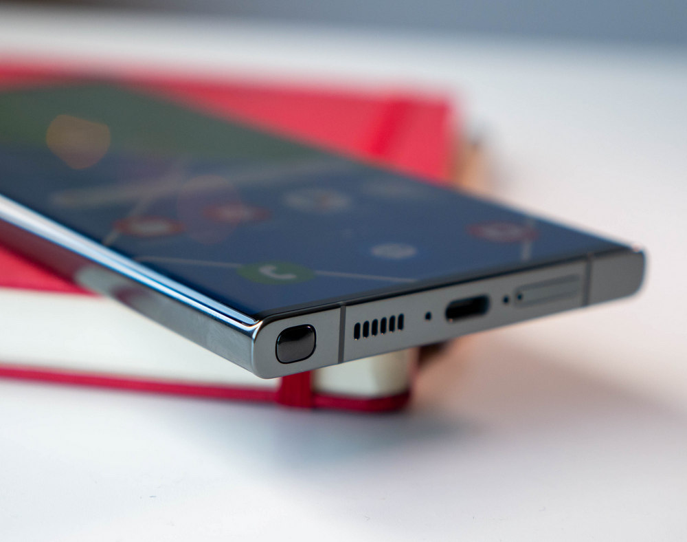 Върху дясната страна са бутоните за включване и за контрол на звука, като позицията им е удобна за лесно достигане. Отзад прави впечатление зоната на камерата, която е в същата подредба като миналата година, но отделните обективи сякаш са заобиколени от малко по-големи пръстени. За камерата ще стане дума след малко, но трите вертикални обектива се превърнаха в обединяващ дизайнерски елемент за цялата серия. В устройството се ползват и два пъти повече компоненти от рециклирани материали спрямо S22 Ultra.