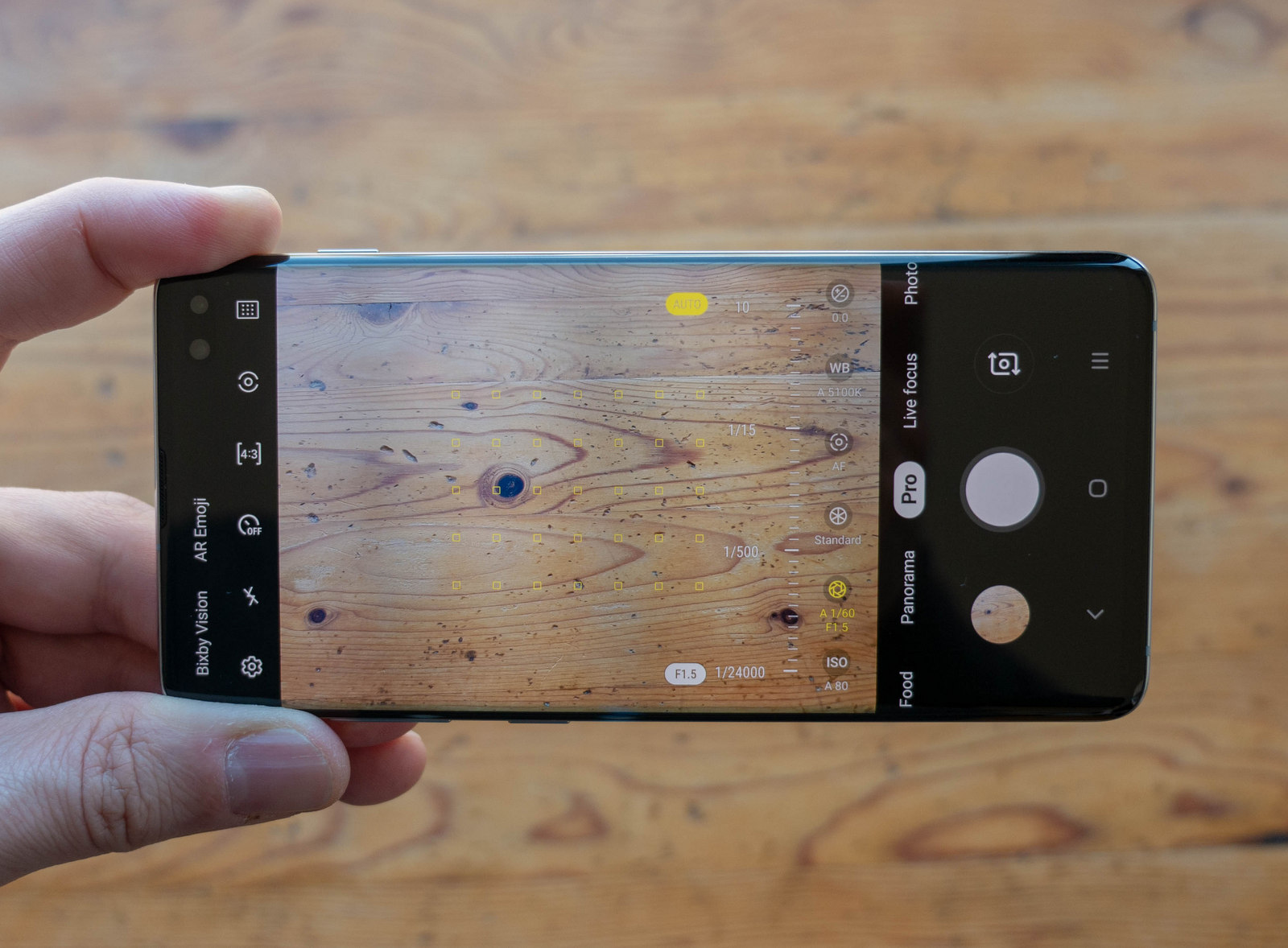 Устройството включва и няколко софтуерни функции, които ще се опитат да ви помогнат да правите по-добри снимки. Бутонът Scene optimizer, който се показва във визьора, ще оптимизира настройките за конкретната снимка. Част от неговите възможности е опцията Bright night, която се активира при много тъмни условия, а освен това откриваме възможност за сканиране на документи и дори добавяне на ефекти към светлините във фона на тъмните сцени. Shot suggestions на свой ред ще ви даде съвети за по-добра композиция на кадъра и ще ви помогне да изправите хоризонта, а flaw detection ще ви уведоми, ако някой в кадъра е мигнал или пък снимката е размазана. Интересно е, че Samsung е премахнала от настройките на камерата опцията за промяна на снимките, така че не се учудвайте, ако не я намерите. В настройките има и опция за коригиране на изкривяването при снимане с ултра широкоъгълната камера, но откриването й не е лесно.