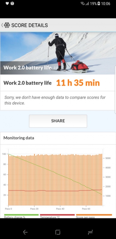 Как се представят батериите, щом трябва да осигурят енергия за толкова големи дисплеи? Доста добре всъщност. Въпреки че компанията е решила да добави батерии с капацитет, който е по-малък от този в Galaxy S7 edge (3000mAh и 3500mAh срещу 3600mAh), това не се отразява негативно на времето за автономна работа, което подсказва за подобрена ефективност на чипсета и компонентите и за допълнителни софтуерни оптимизации. Намалената екранна резолюция по подразбиране също помага за това. Резултатите могат да се подобрят още, ако се изключи функцията Always on display и се използва тъмна тема на интерфейса вместо бялата по подразбиране. В теста Work 2.0 на приложението PCMark за разреждане на батерията от 100% до 20% Galaxy S8 постигна резултат от 10:11 часа с включен дисплей в продължение на 8:36 часа, което е много впечатляващо постижение за телефон с 3000 mAh батерия. В същия тест Galaxy S8+ постигна 11:35 часа с активен екран в продължение на 9:52 часа. За сравнение, Huawei Mate 8 със своята 4000 mAh батерия успя да завърши теста за 11:32 часа.